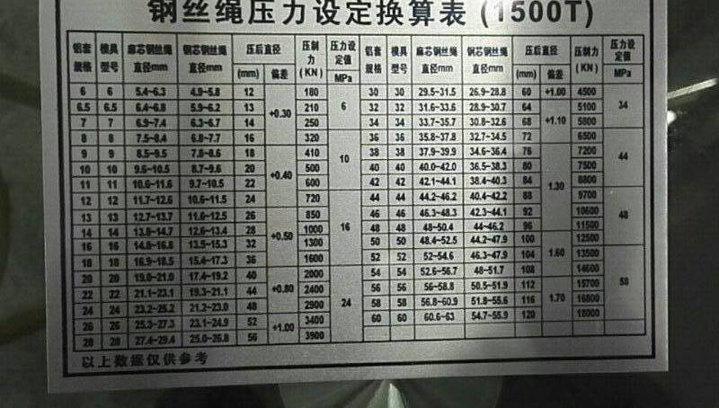 首先模具和鋁套型號(hào)是必須對(duì)應(yīng)的,比如6mm鋁套就用6#壓套機(jī)模具,8mm鋁套就用8#模具,而鋼絲繩的尺寸不一定是整數(shù),廠家配的模具正常都是偶數(shù)配,壓到?jīng)]對(duì)應(yīng)尺寸的鋼絲繩,這點(diǎn)不用擔(dān)心,模具都是有壓制范圍的,正常用1mm的上下范圍,比如15mm的鋼絲繩,可以用14mm或16mm的模具,總之最好的分別方法就是,不管鋼絲繩的尺寸是多少,找數(shù)值離得最近的模具就壓就可以了。還有一個(gè)重點(diǎn),剛剛說(shuō)的情況都是麻芯的鋼絲繩,而鋼芯的鋼絲繩正常都是比麻芯的鋼絲繩所用模具大一個(gè)型號(hào)。參數(shù)這樣的方法,客戶在使用鋼絲繩壓套機(jī)模具時(shí)就不會(huì)不知道如果選擇了。